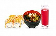 По будням с 12.00 до 17.00 Калифорния ролл + суп на выбор(Мисо или Кимчи)+ напиток на выбор(ключевая вода, сок, морс)